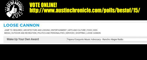 Jolly Ranchers, we need your help. Rancho Alegre has been nominated in the Loose Cannon category for Tejano/Conjunto music advocacy on the Austin Chronicle's Best of Austin ballot! We would appreciate the support in any category, as would the rest of Austin's Tejano industry!